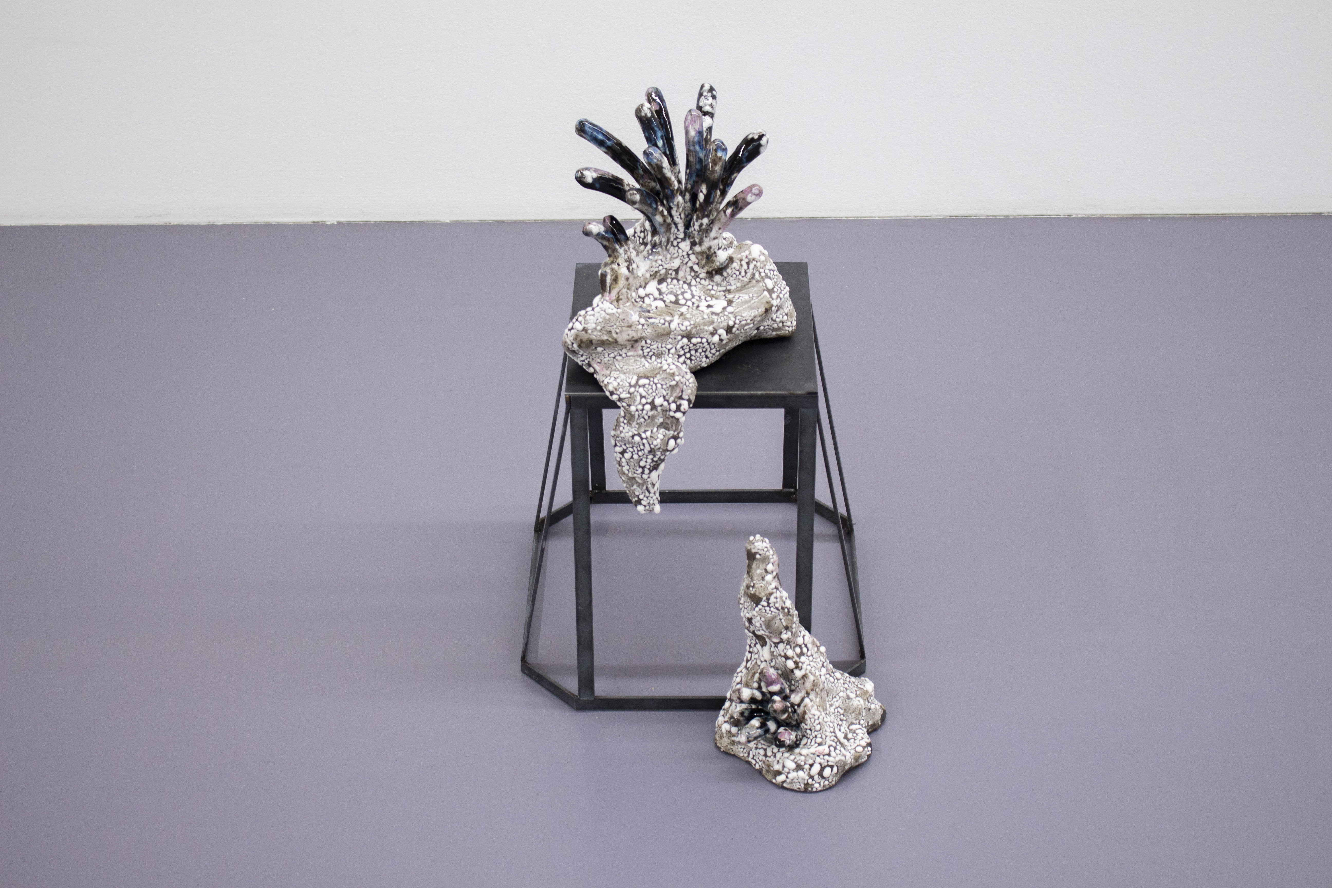 Formale Entscheidungen entstanden im gemeinsamen Prozess. Die Beschränkung auf farblose beziehungsweise naturfarbene Arbeiten erzeugt eine visuelle Zurückhaltung, innerhalb derer Materialität, Oberfläche, Maßstab und räumliche Interventionen an Bedeutung gewinnen. Die Arbeiten treten in einen offenen Dialog miteinander und mit der Architektur, ohne sich hierarchisch zu ordnen.