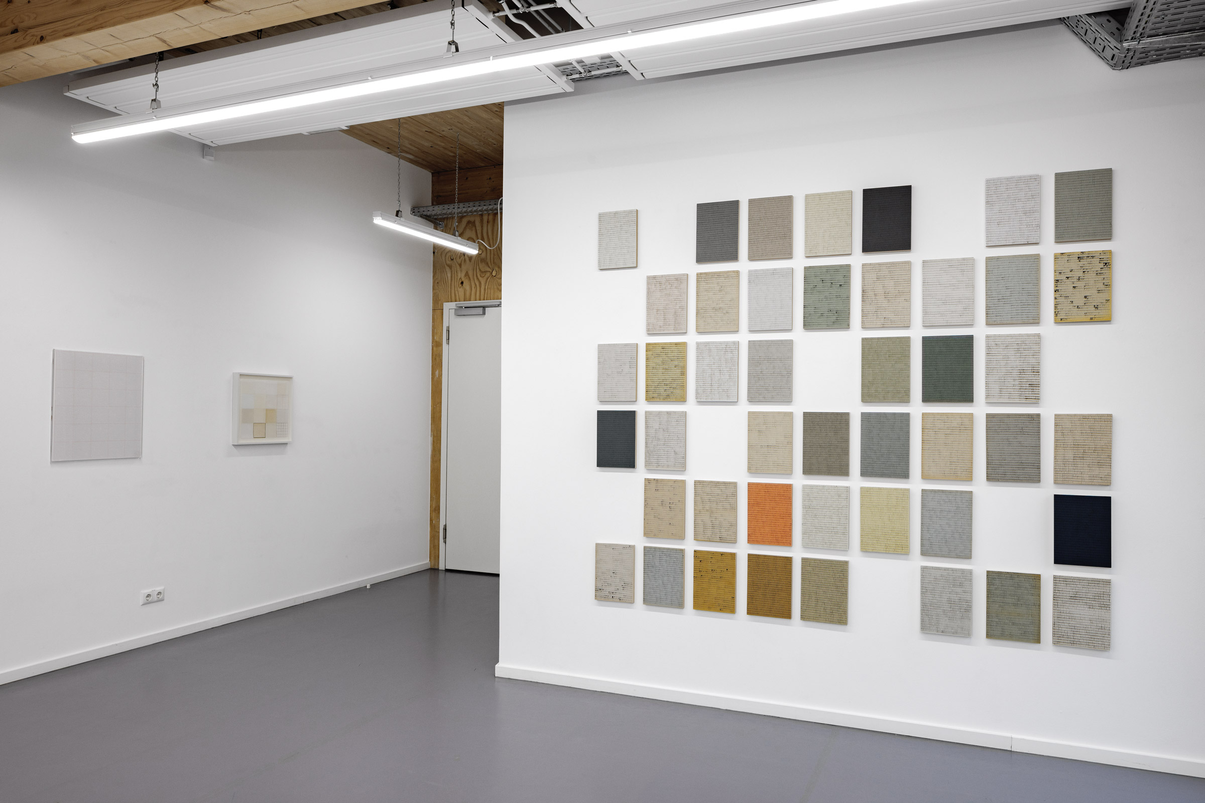 Auch bei den Stempelzeichnungen im DIN-A4-Format, die in der Ausstellung als offenes Raster gehängt sind, so ein Ensemble bilden, das durch Leerstellen auch die Wand als mitgestaltendes Element einbezieht, meint man bisweilen dieses Echo zu vernehmen. Dies ist umso interessanter, weil sich das Raster auf den einzelnen Papierbögen erst durch das manuelle Wiederholen ergibt, das additive Verfahren des Stempelns ein nur scheinbar maschinelles Gerüst hervorbringt. Je nach Entfernung der Betrachtenden zu den verschiedenfarbigen, nun zeichnerisch bearbeiteten Papieren wandelt sich die scheinbar systematische Struktur in ein vibrierendes Feld kleiner Abweichungen. Das Raster wird zu einer Zeichnung des Zufalls.