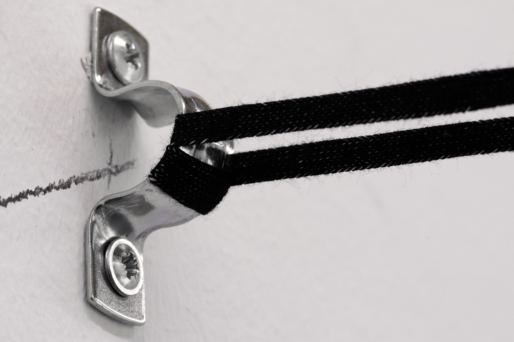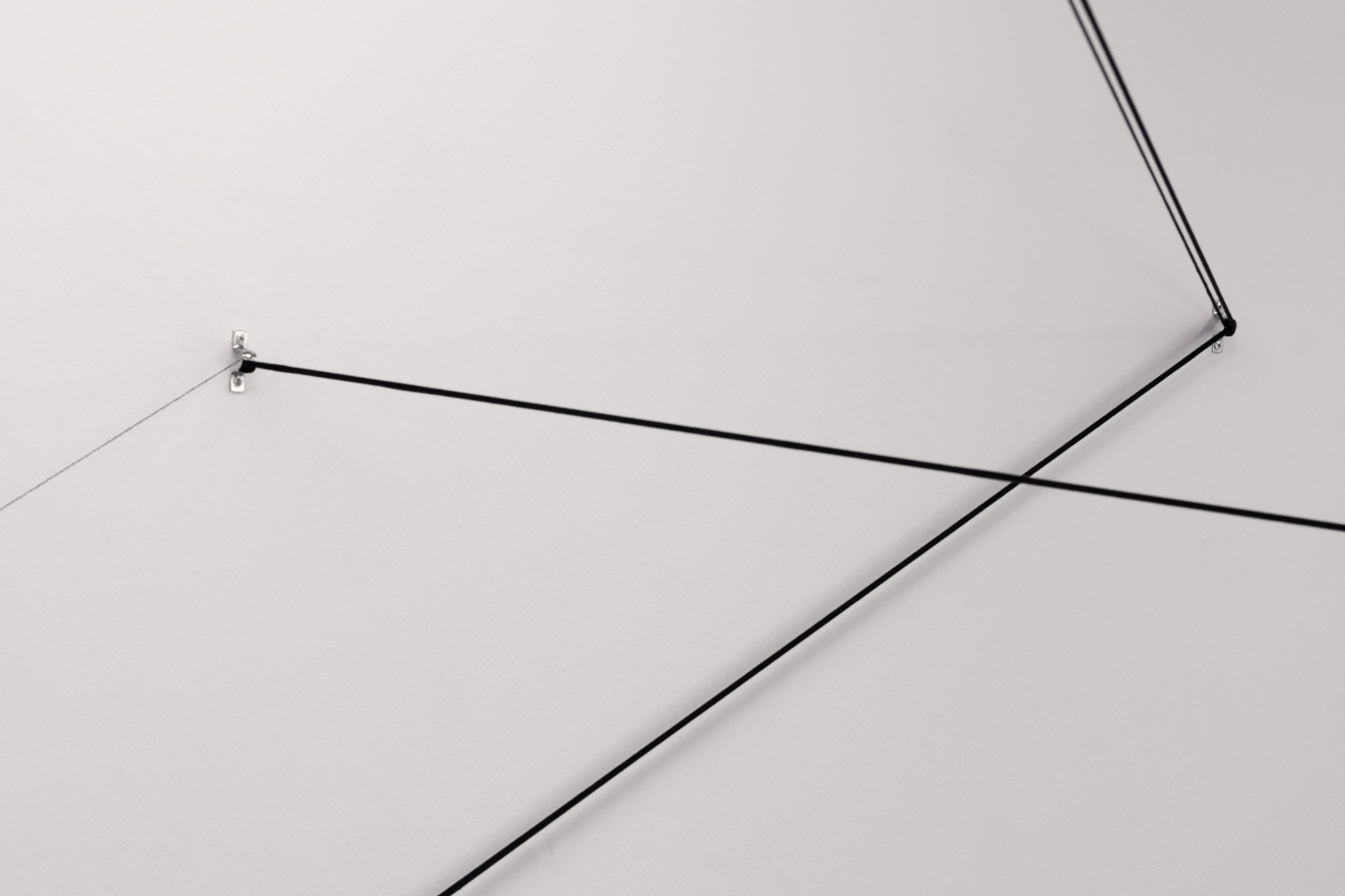 Diese drei Elemente sind dabei nicht als Teile eines großen Ganzen zu verstehen, sondern als separate Bestandteile der Ausstellung. Was sie jedoch verbindet, ist, dass sie jeweils zu einer Neujustierung der Präsenz des Besuchers im Raum beitragen: Da ist zum einen – unübersehbar schon beim Betreten des Raums – die mittige Installation, bestehend aus elastischen Bändern, die sich, an den Wänden befestigt, mehrfach durch den Raum spannen. Je nach Körpergröße, Position im Raum, Kondition, Blickwinkel, Wagemut oder schlichter Neugierde stellt die Installation Fragen. Ist es nur ein Band oder sind es mehrere? Wie oft kreuzen sich die Linien im Raum? Entstehen Dreiecke? Vierecke? Wie viele? Können wir den durch die Bänder umrissenen Raum beschreiten, durchqueren, durchkreuzen? Dürfen wir? Die Bänder berühren? Sind sie elastisch? Ist der gezeichnete Raum überhaupt ein materieller Raum? Was sagt das über unsere Wahrnehmung aus? Fest steht: die wie eine Zeichnung in den Raum gespannten Linien üben eine starke Präsenz aus, zu der wir uns verhalten, unsere eigene Präsenz ermessen, uns in Verhandlung mit dem Raum begeben müssen.