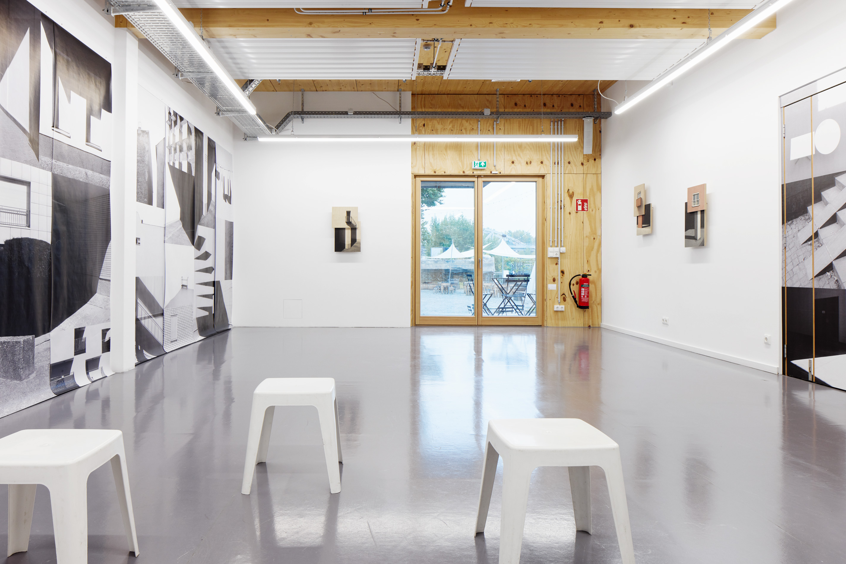 The Toulouse-born, Berlin-based artist uses photographic material in the exhibition space to test how architecture connects with an outside and how a new view of the built environment can emerge by alienating familiar codes of perception. Catugier's black-and-white photo collages, printed in large format on poster surfaces, show architectural elements (exterior walls, stairway steps, windows, etc.), which she depicts in such a nested manner and combines in such a striking way that it only becomes clear at second glance where the boundaries of the individual motifs run: Is the gray sky there actually a firewall? How can the imaginary shadow of the garages appear here so naturally on the neighboring motif? Are there actually many different buildings? Is it only one or even one per single motif?